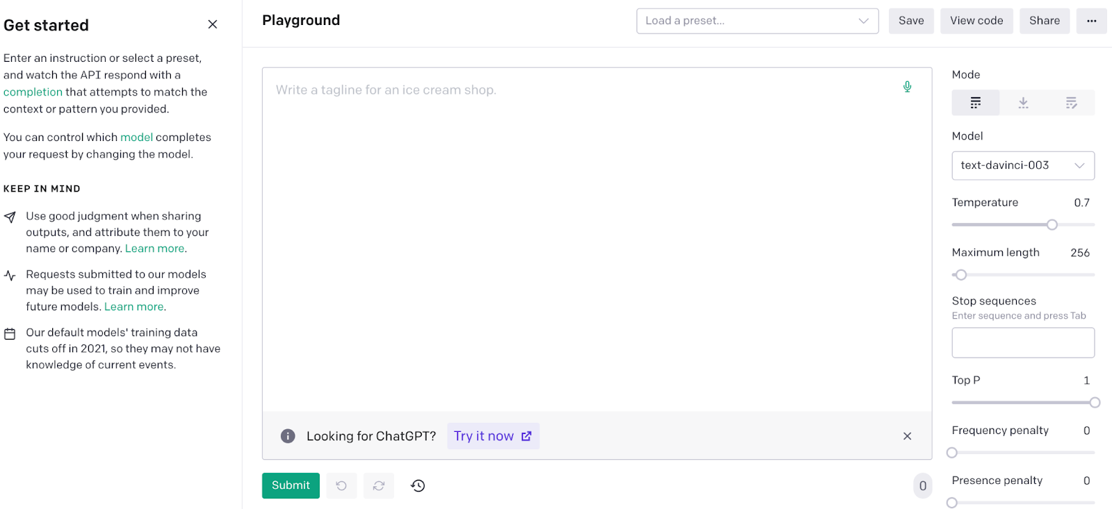 Users can tweak a wide variety of parameters, including temperature, maximum length, stop sequences, and penalty settings. It's important to be aware of OpenAI's data usage policies, as submitted content may be used for model improvements unless you are on a business plan with a zero data retention policy. While current models like GPT-4 have more recent knowledge cutoffs (e.g., April 2023), they may still lack understanding of very recent or real-time events.