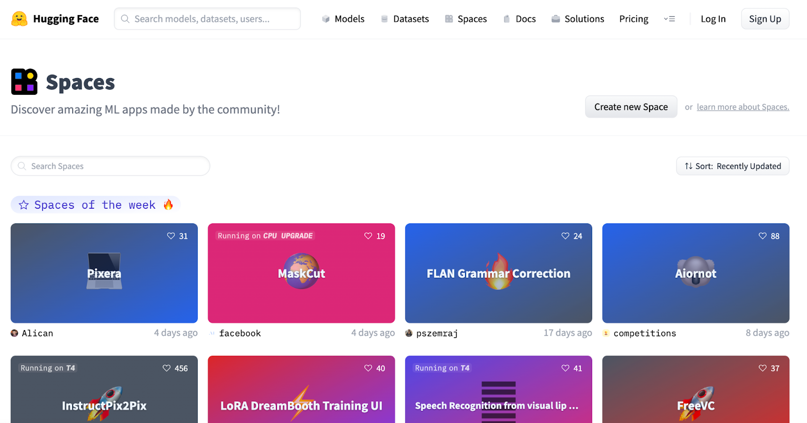 While not a typical AI playground, HuggingFace Spaces lets users discover and run thousands of machine learning apps created by the AI community. Users can try demos of various open-source models for tasks like Large Language Model (LLM) chat, text-to-image generation (e.g., Stable Diffusion variants), voice cloning, and video generation directly in their browser.