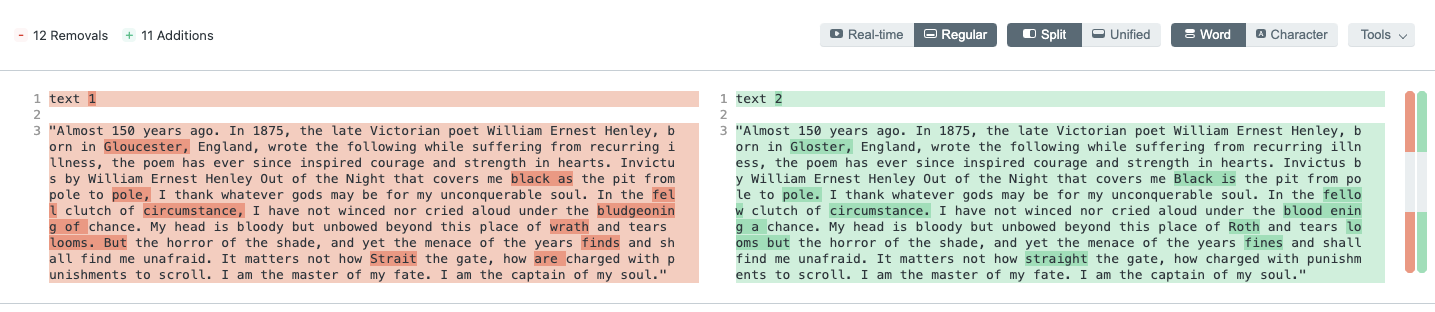 As you can see, Text 1 has 12 removals and Text 2 has 11 additions. Look closely at the highlighted text to spot some of the nuances, such as "black as" in Text 1 vs. "Black is" in Text 2.