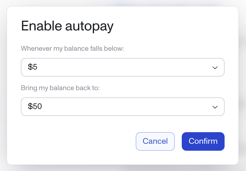 Auto-pay automatically recharges your account when your balance falls below a specified threshold. When triggered, it charges your card to bring your balance back to a predetermined amount. Auto-pay is recommended for production environments to prevent service interruptions.