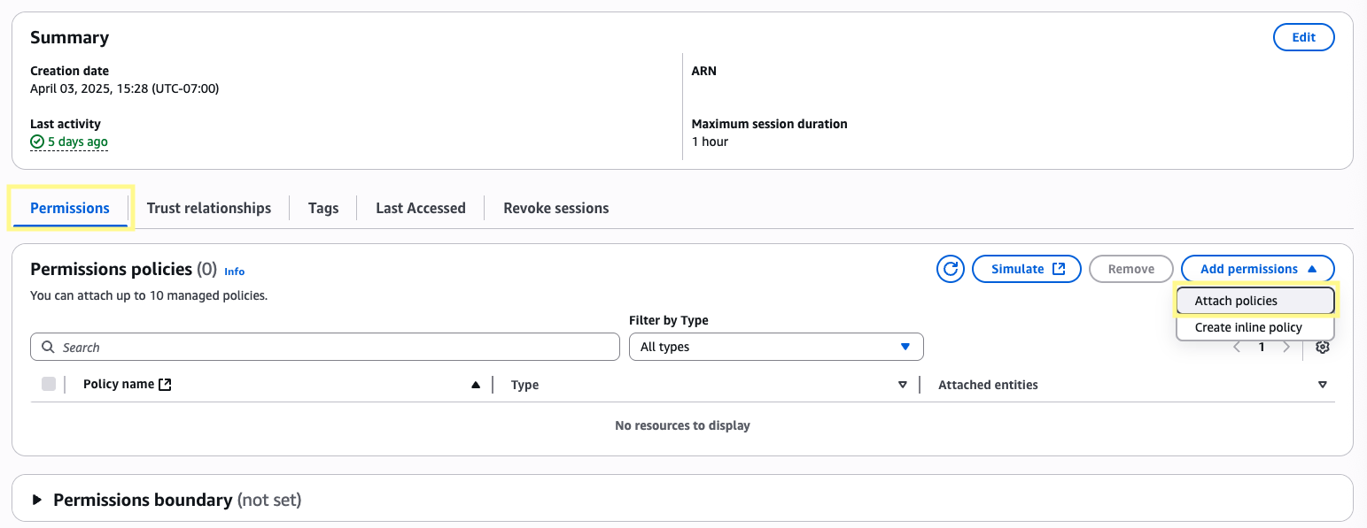 Now, navigate to the IAM services page. On the left side panel under Access Management, click Roles and search for your Lambda function’s role (its structure should look like <function_name>-<role_id>). Click the role and then in the Permissions policies section click the dropdown for Add permissions and then select Attach policies.