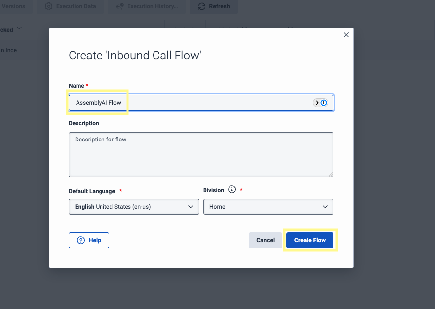 Within the Architect tool, click Add to create a new call flow. Enter a Name for your flow and click Create Flow. Select the newly created flow to open the drag and drop editor.