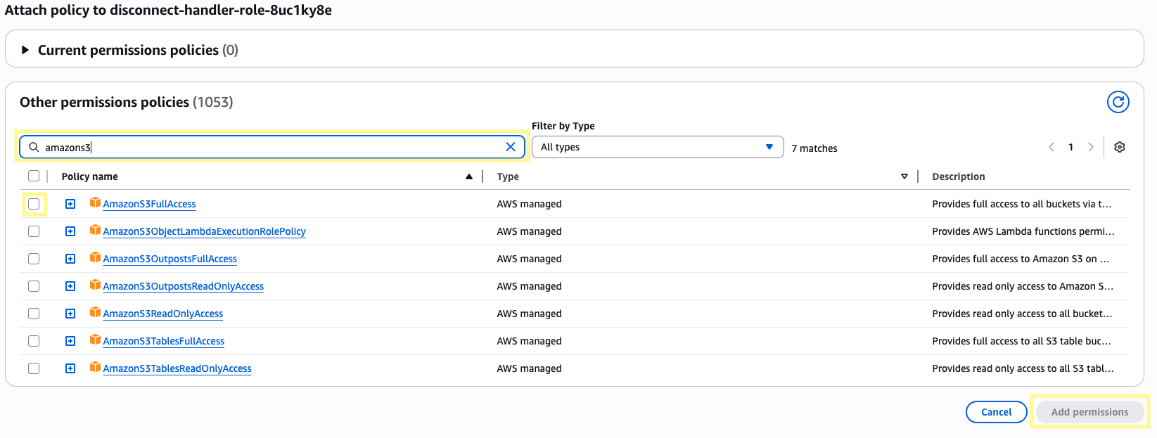From this page, find the policies named AmazonS3FullAccess and CloudWatchEventsFullAccess. Click Add permissions for both.