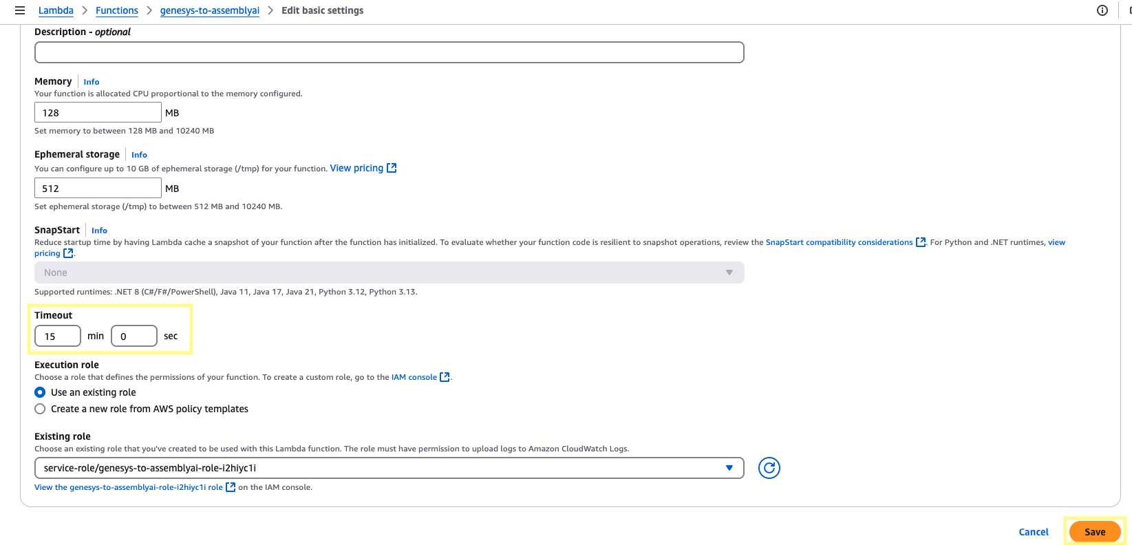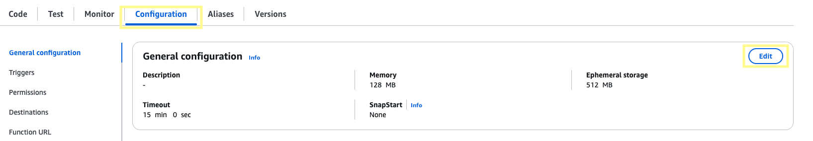 On the same page, navigate to the Configuration section. Under General configuration, click Edit, and then adjust Timeout to 15min 0sec and click Save. The processing times for transcription will be much shorter, but this ensures the function will have plenty of time to run.