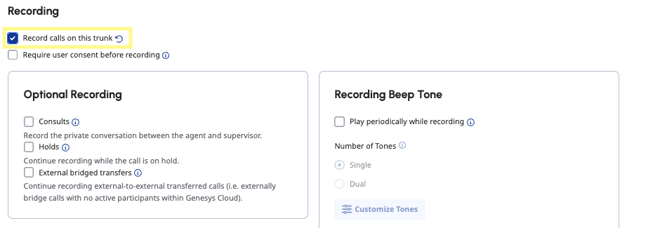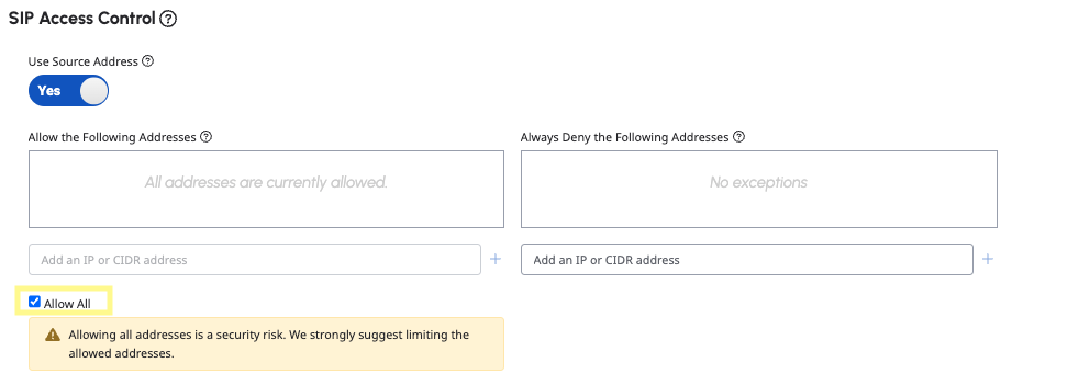 Under SIP Access Control, select Allow All (note: this is only for development and testing purposes, please specify actual IPs in production). Under the Media section, make sure you select Record calls on this trunk. Then click Save External Trunk (it may take a few moments for your trunk to be ready).