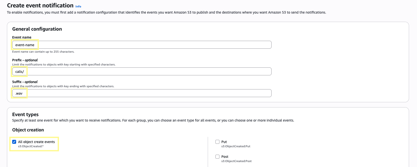 Give the event a name and then in the Prefix section enter calls/ (or whatever S3_KEY_PREFIX is set to), and in the Suffix section enter .wav. This will ensure the event is triggered once our wav file has been uploaded. In the Event types section, select All object create events.