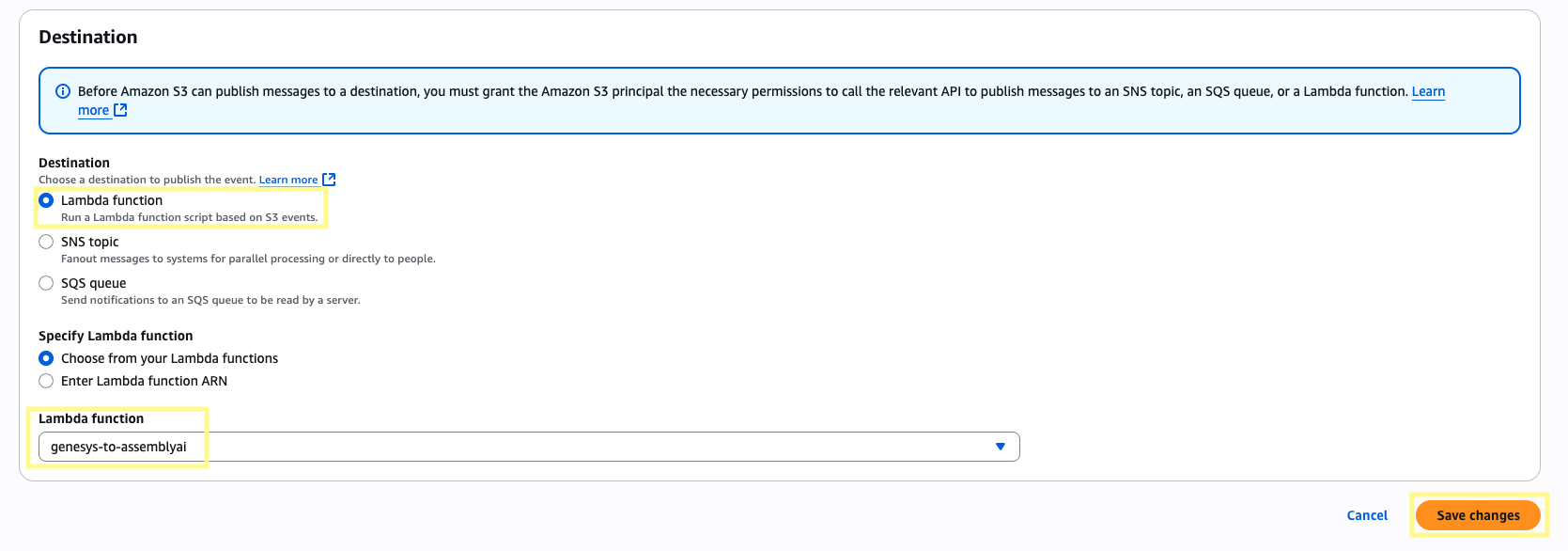 Scroll down to the Destination section, set the destination as Lambda function and then select the Lambda function we created in Step 6. Then click Save changes.