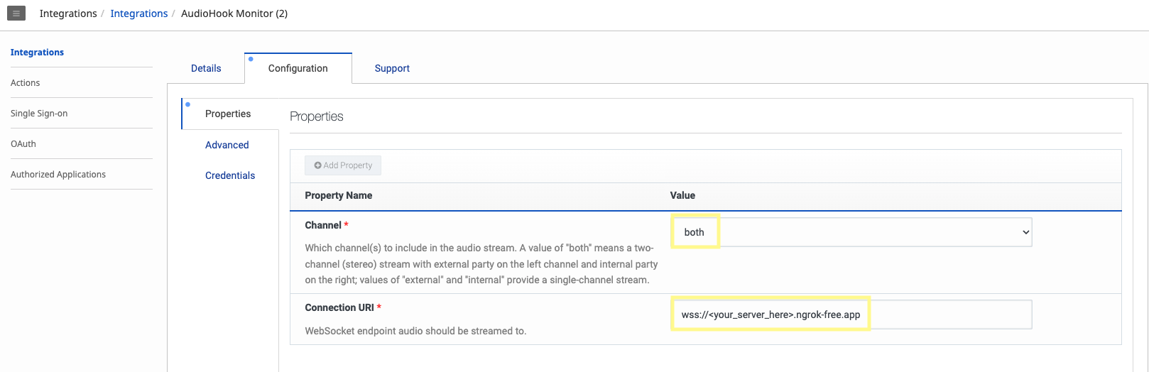 Navigate to the AudioHook Monitor’s Configuration tab. Under the Properties section, make sure both channels are selected and the Connection URI is set to the ngrok url from the previous step. For the ngrok url, replace https with wss.