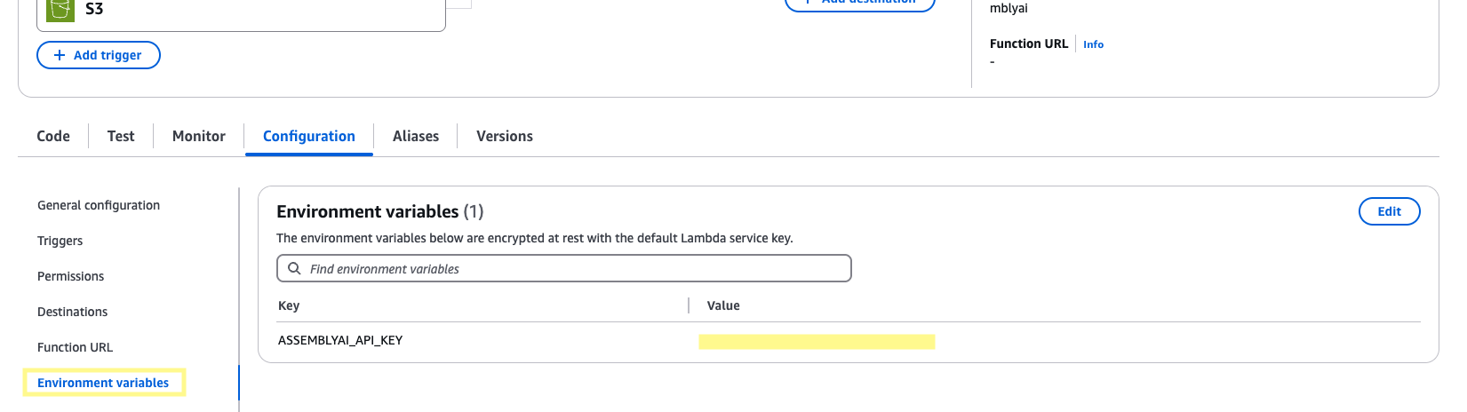 On the left side panel, click Environment variables. Click Edit. Add an environment variable, ASSEMBLYAI_API_KEY, and set the value to your AssemblyAI API key. Then click Save.