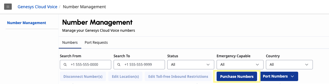 Navigate to the Number Management page under the Genesys Cloud Voice section and select Purchase Numbers. Enter an area code and click Search. Select a phone number from the list and click Complete Purchase.