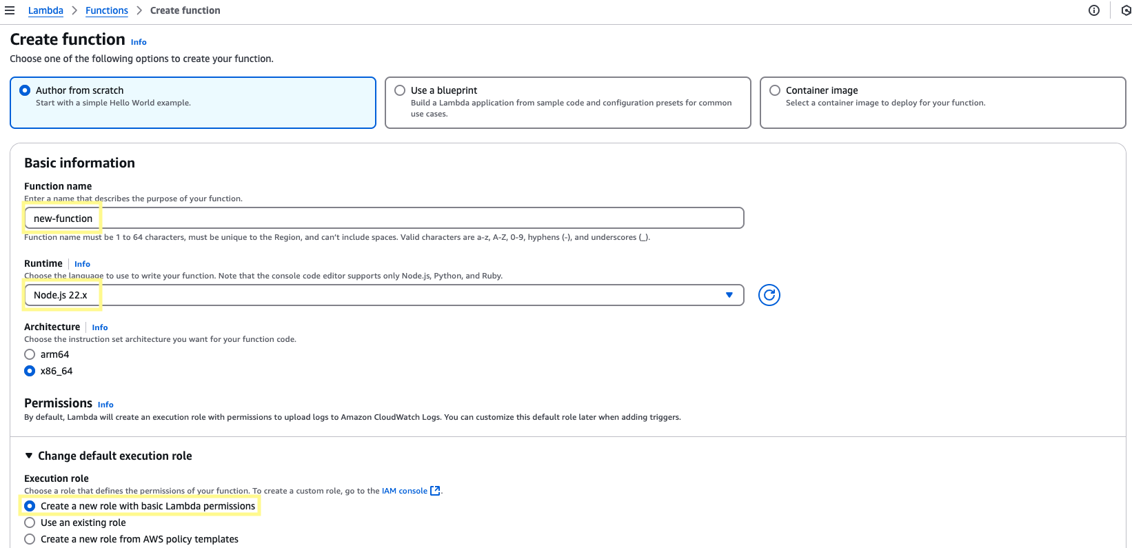 Navigate to the Lambda services page, and create a new function. Set the runtime to Node.js 22.x. In the Change default execution role section, choose the option to create a new role with basic Lambda permissions. Assign a function name and then click Create function.