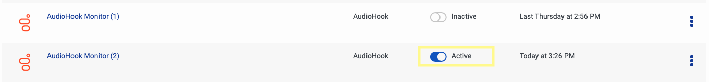 Back on the Integrations page, click the toggle button under the Status column to activate your AudioHook. Genesys will attempt to verify our server is correctly configured according to the AudioHook protocol. If it is unable to do so, a red error will show with the reason for the failed connection. If it succeeds, the connection will toggle to Active.