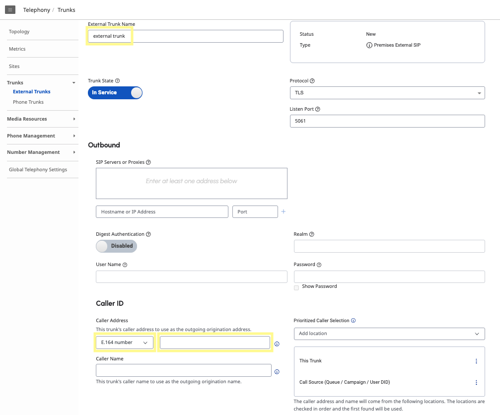 Under the Telephony section, navigate to the External Trunks page. Click Create New. Under Caller ID, the Caller Address will be an E.164 number and the phone number you created.
