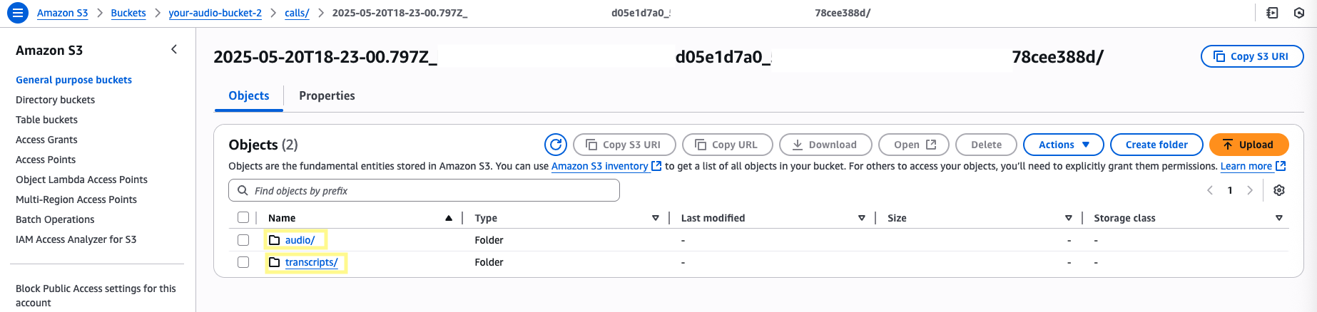 Head to your S3 bucket. Within the /calls directory, files will be stored under a unique identifier with the following structure: