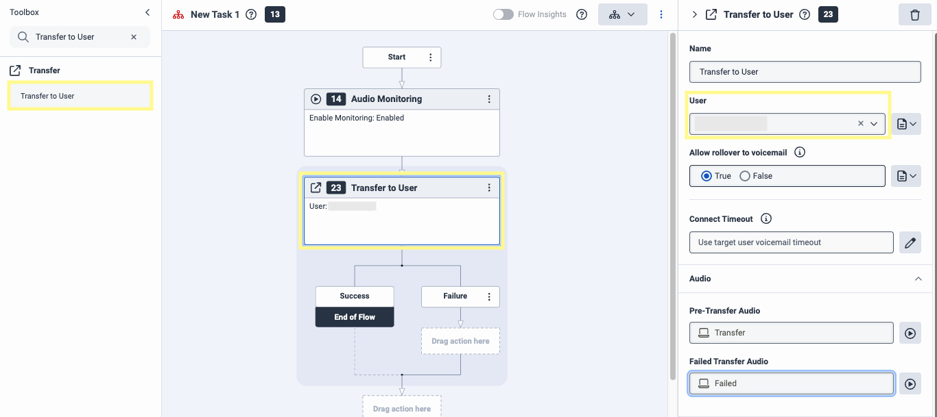 Back in the Toolbox, search for Transfer to User and set that as the next step. In the right-hand menu, under User select a caller. Under Pre-Transfer Audio and Failed Transfer Audio, type your preferred messages.