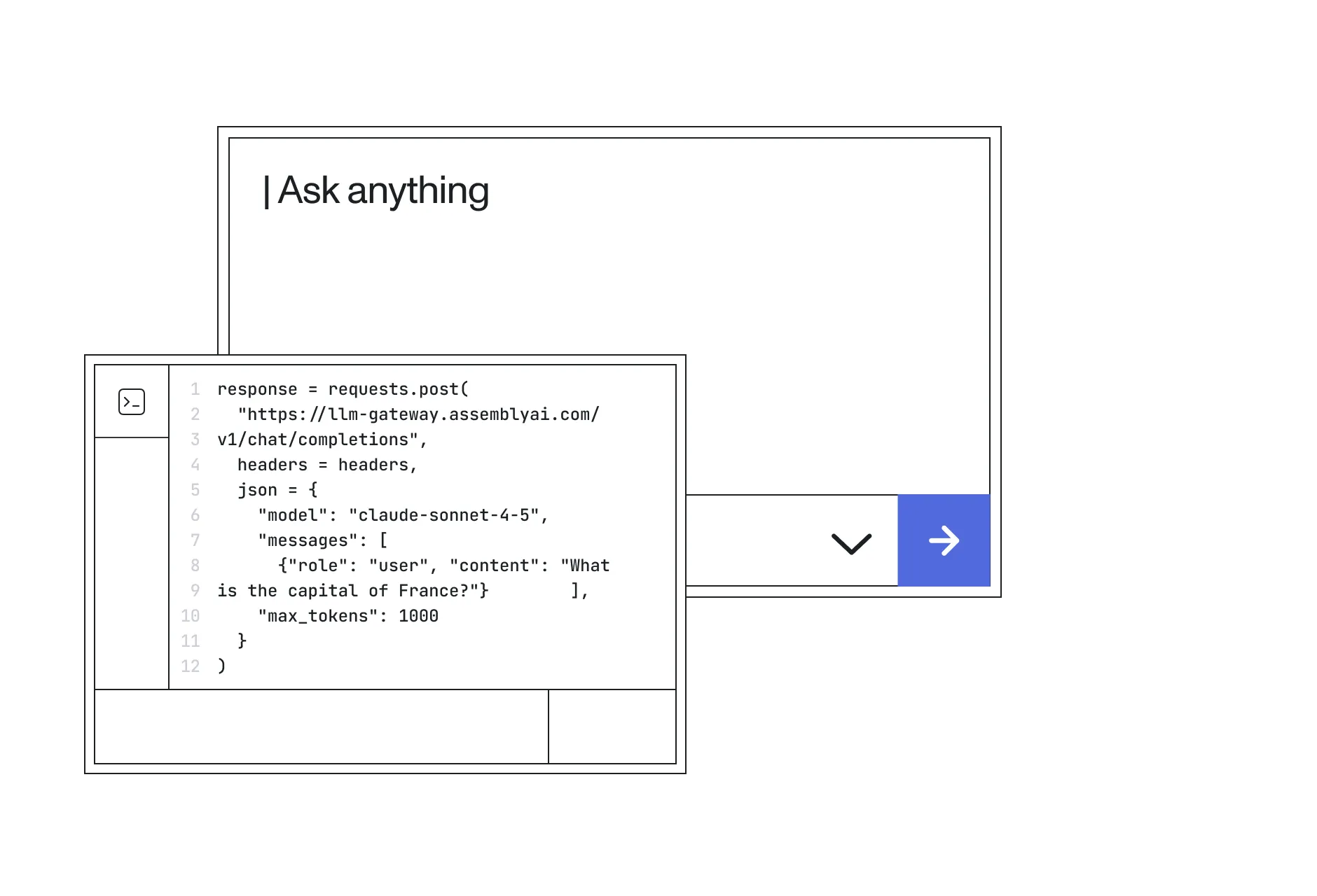 Create an AssemblyAI account and get your API key. Then POST tohttps://llm-gateway.assemblyai.com/v1/chat/completions with header authorization: , a model, and your messages/prompt or transcript text. LLM Gateway routes to multiple providers (GPT, Claude, Gemini) through one unified API.