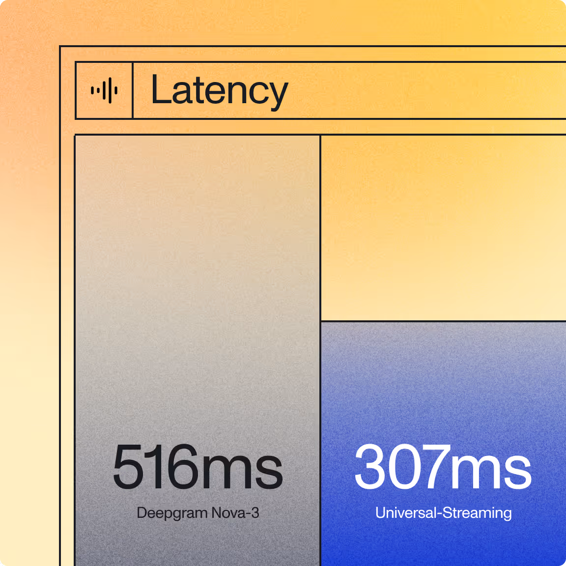 41% faster median latency than Deepgram Nova-3 (307 ms vs 516 ms) and nearly 2× faster on P99 latency (1,012 ms vs 1,907 ms).